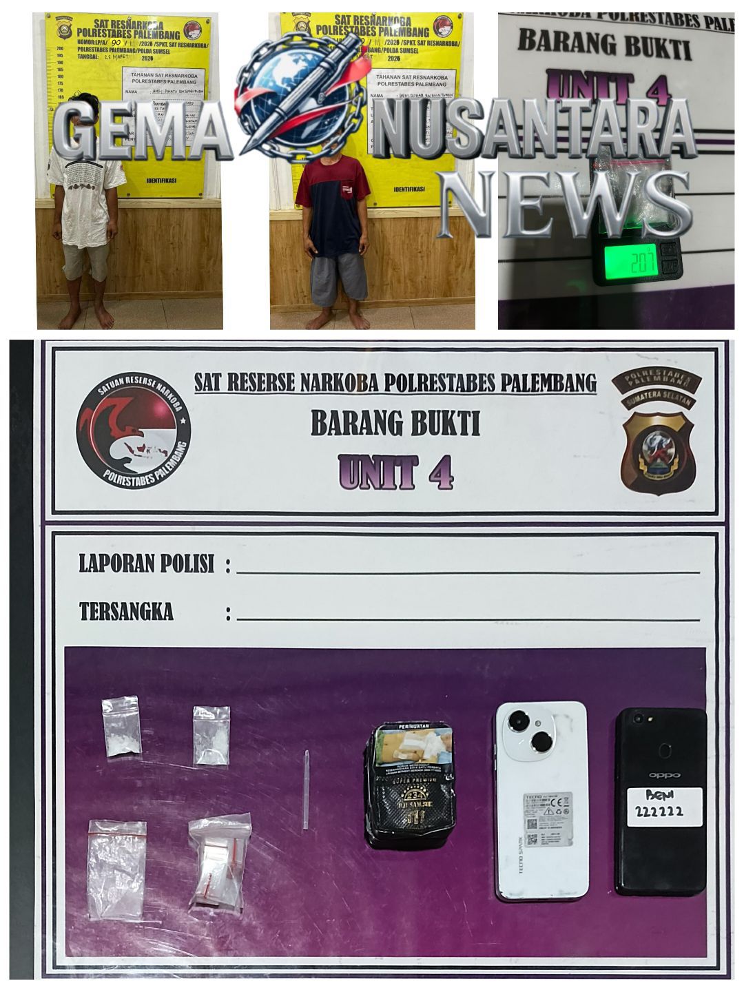 Saat ini, kedua tersangka beserta seluruh barang bukti telah diamankan di Mapolrestabes Palembang untuk menjalani proses penyidikan lebih lanjut.